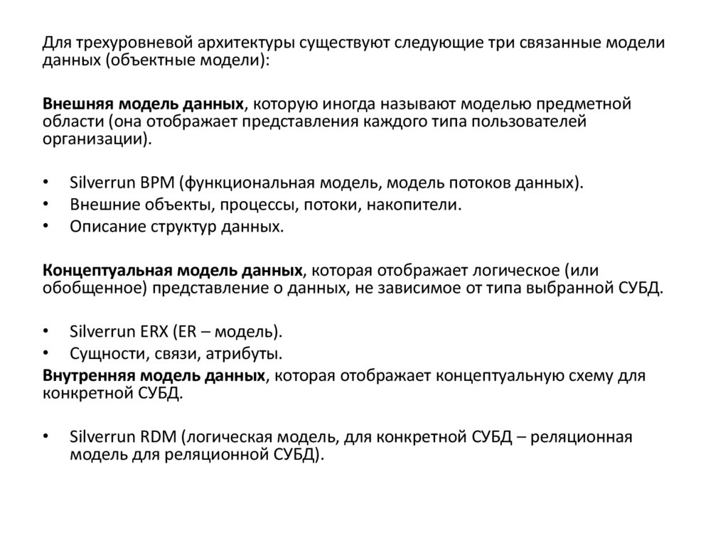 Для трехуровневой архитектуры существуют следующие три связанные моделиданных (объектные модели):