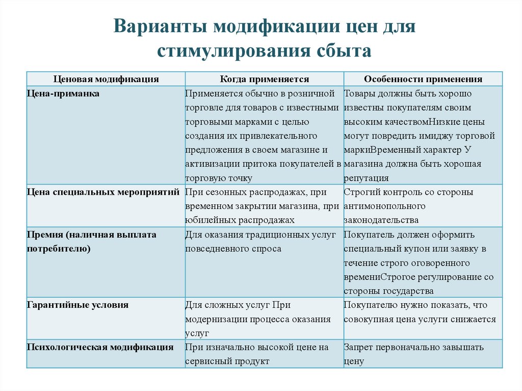 Варианты модификации цен длястимулирования сбыта