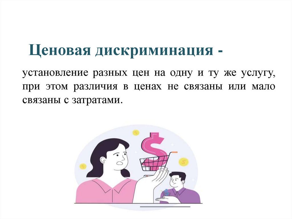 Ценовая дискриминация установление разных цен на одну и ту же услугу,при этом различия в ценах не связаны или мало