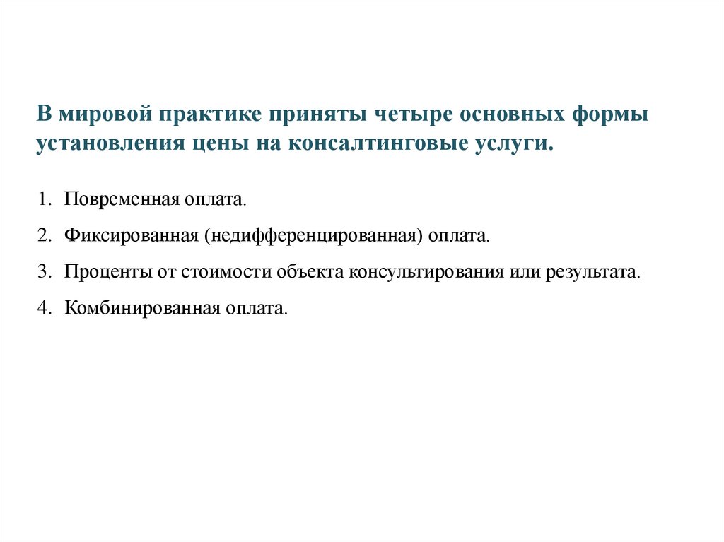 В мировой практике приняты четыре основных формыустановления цены на консалтинговые услуги.