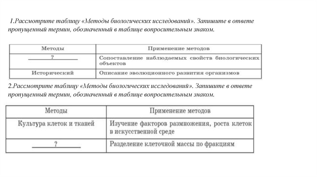 1.Рассмотрите таблицу «Методы биологических исследований». Запишите в ответепропущенный термин, обозначенный в таблице вопросительным знаком.