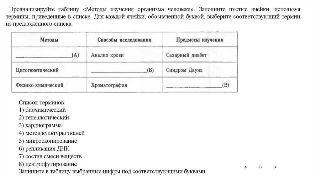 Проанализируйте таблицу «Методы изучения организма человека». Заполните пустые ячейки, используятермины, приведённые в списке. Для каждой ячейки, обозначенной буквой, выберите соответствующий термин