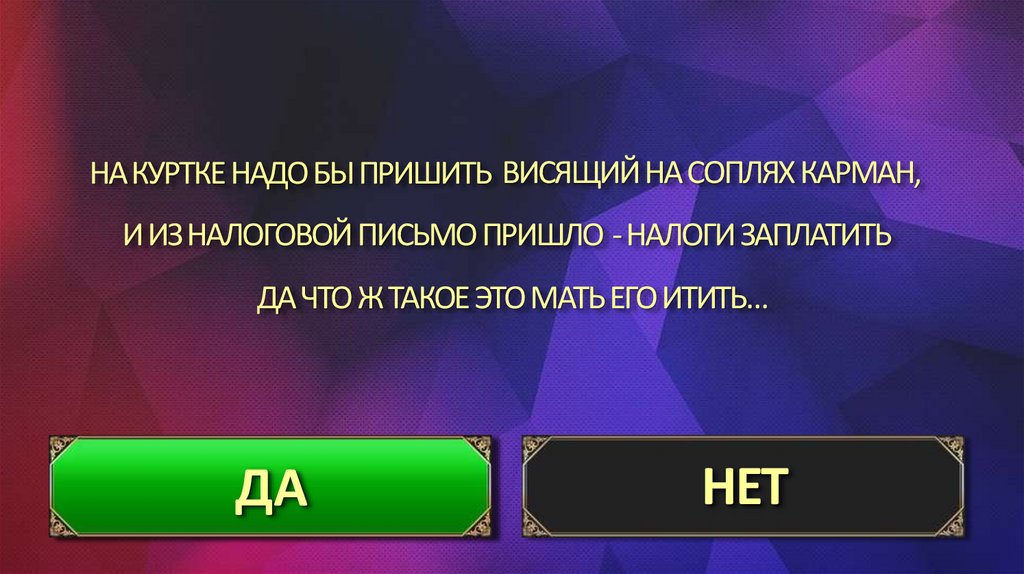 НА КУРТКЕ НАДО БЫ ПРИШИТЬ ВИСЯЩИЙ НА СОПЛЯХ КАРМАН,И ИЗ НАЛОГОВОЙ ПИСЬМО ПРИШЛО -НАЛОГИ ЗАПЛАТИТЬ