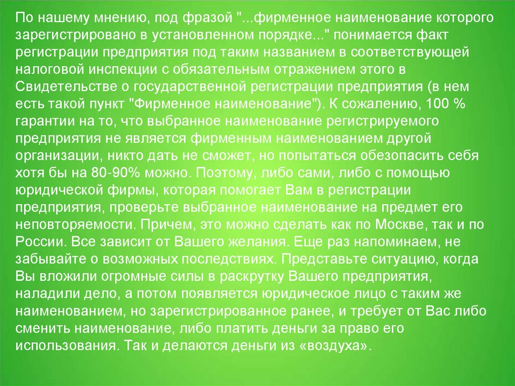 По нашему мнению, под фразой "...фирменное наименование которогозарегистрировано в установленном порядке..." понимается факт