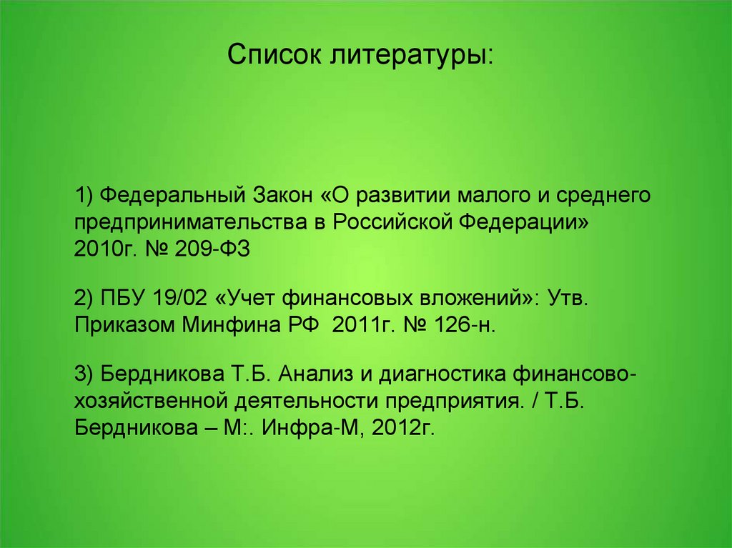 Список литературы:1) Федеральный Закон «О развитии малого и среднего