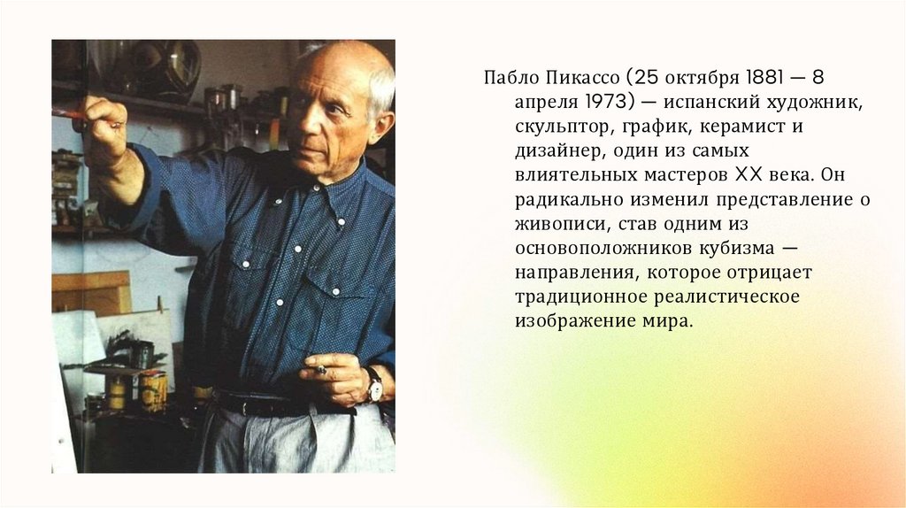 Пабло Пикассо (25 октября 1881 — 8апреля 1973) — испанский художник,