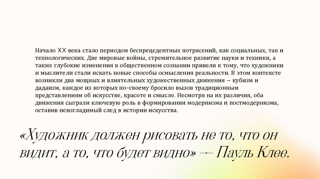 дадаизм, каждое из которых по-своему бросило вызов традиционным