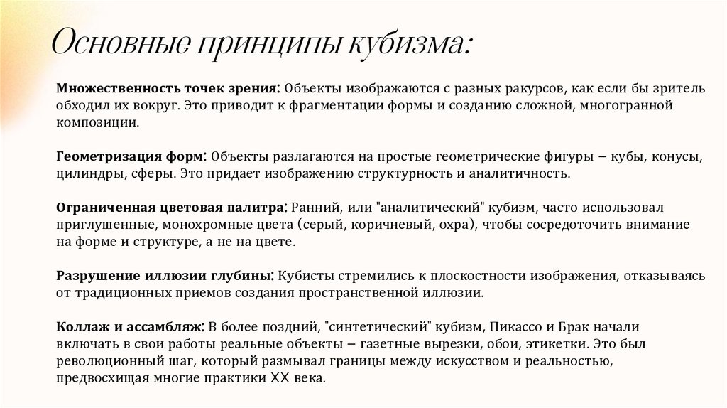 Основные принципы кубизма:Множественность точек зрения: Объекты изображаются с разных ракурсов, как если бы зритель