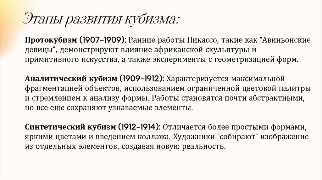 Этапы развития кубизма:Протокубизм (1907-1909): Ранние работы Пикассо, такие как "Авиньонские