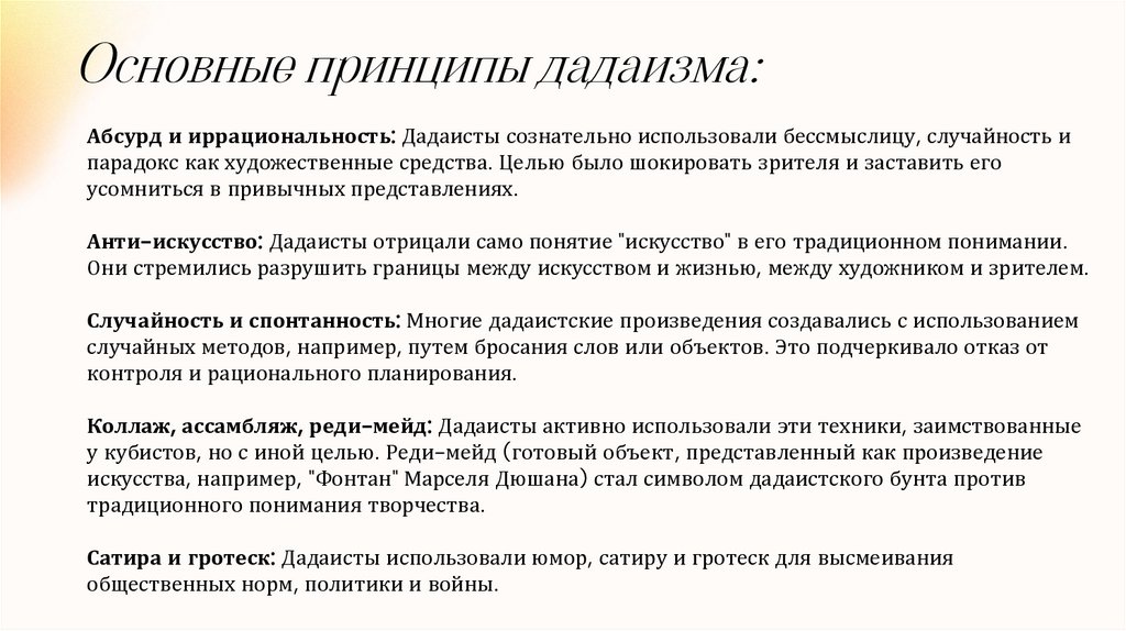 Основные принципы дадаизма:Абсурд и иррациональность: Дадаисты сознательно использовали бессмыслицу, случайность и
