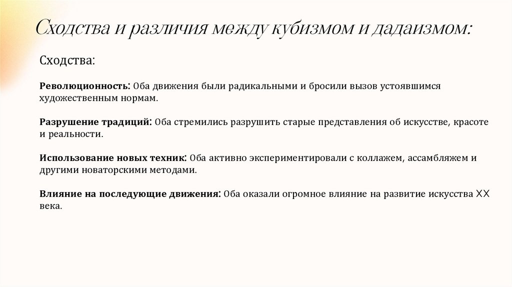 Сходства и различия между кубизмом и дадаизмом:Сходства: