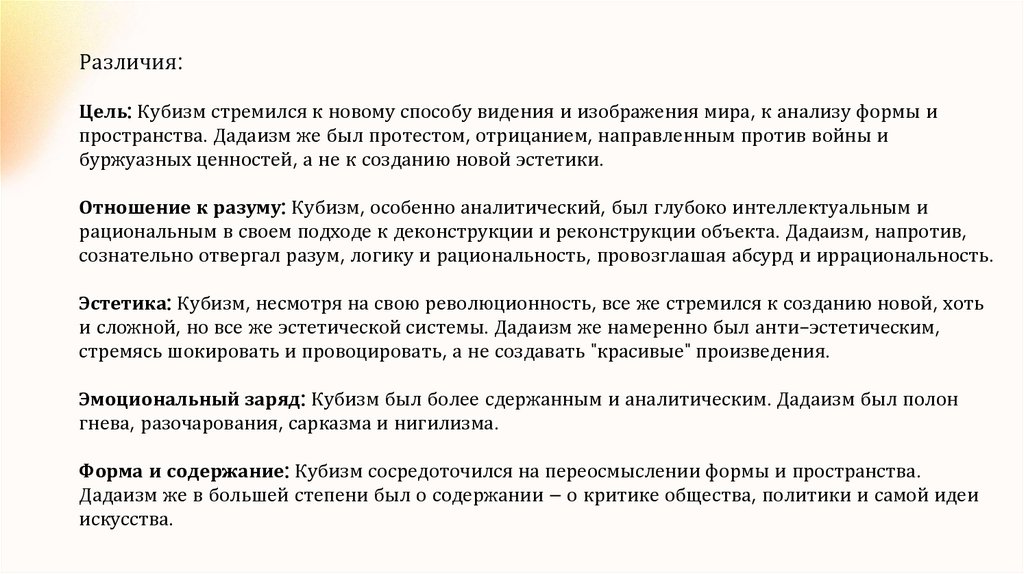 Эмоциональный заряд: Кубизм был более сдержанным и аналитическим. Дадаизм был полон