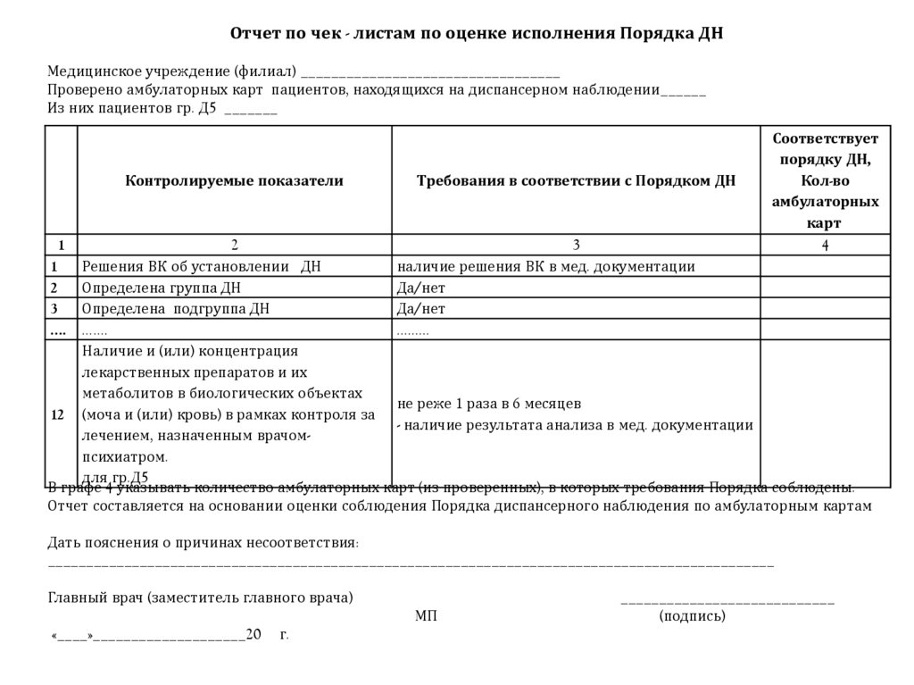 Отчет по чек - листам по оценке исполнения Порядка ДНМедицинское учреждение (филиал) __________________________________