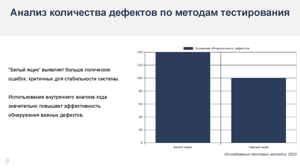 Анализ количества дефектов по методам тестирования"Белый ящик" выявляет больше логических