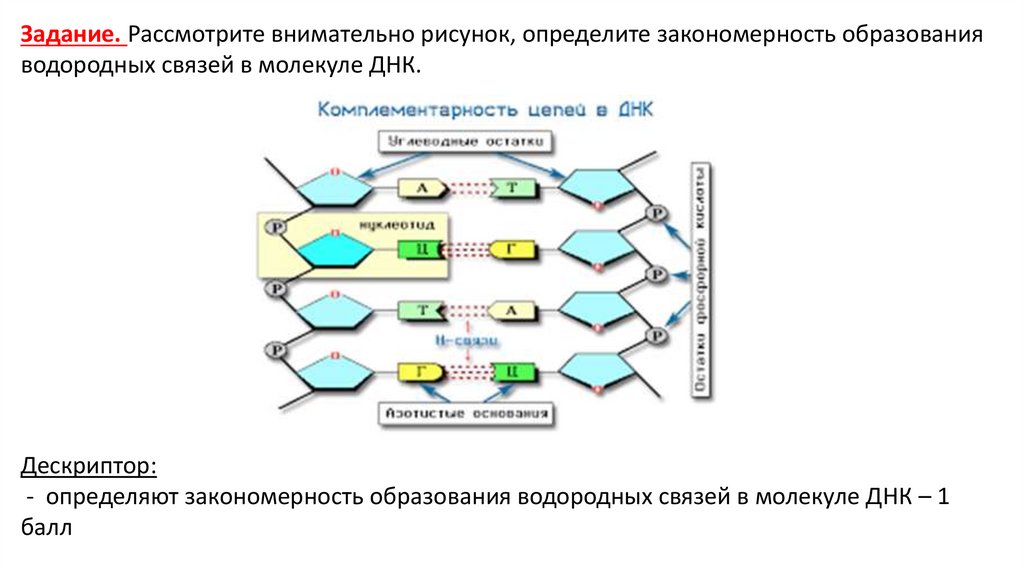 Задание. Рассмотрите внимательно рисунок, определите закономерность образованияводородных связей в молекуле ДНК.