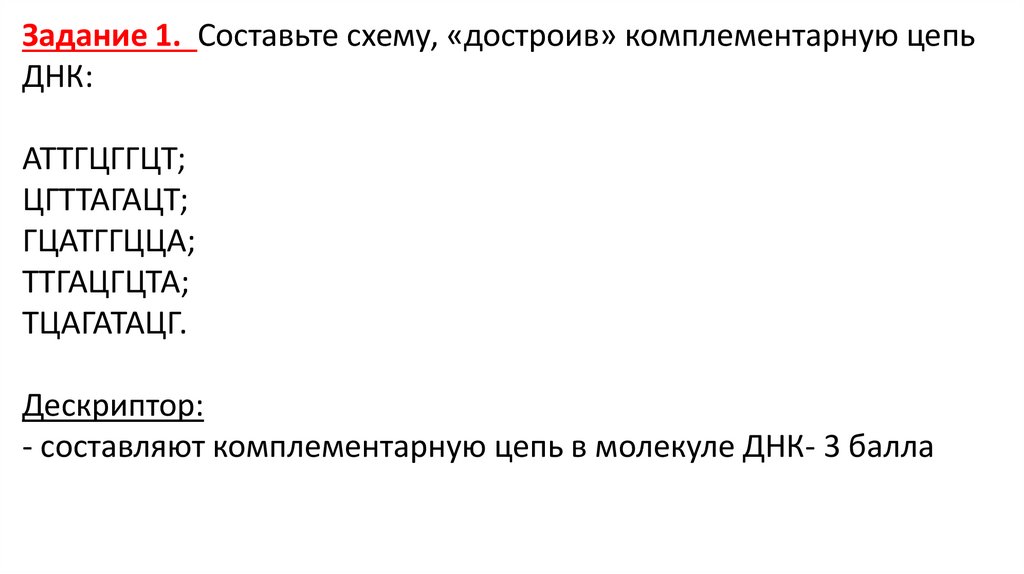 Задание 1. Составьте схему, «достроив» комплементарную цепьДНК:
