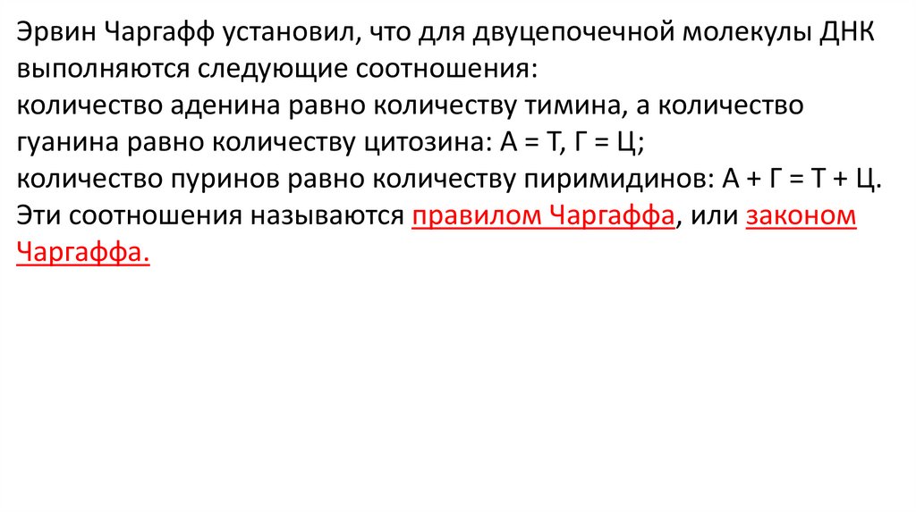 Эрвин Чаргафф установил, что для двуцепочечной молекулы ДНКвыполняются следующие соотношения:
