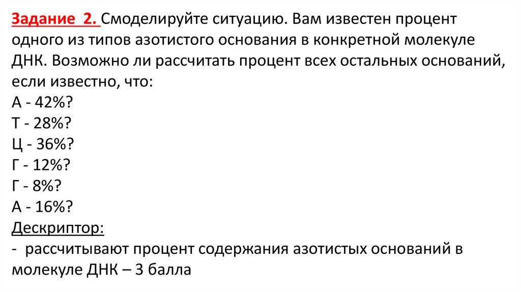 Задание 2. Смоделируйте ситуацию. Вам известен процентодного из типов азотистого основания в конкретной молекуле
