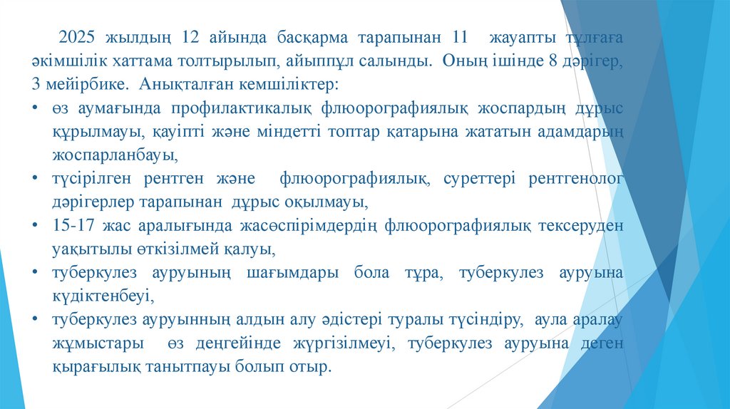 2025 жылдың 12 айында басқарма тарапынан 11 жауапты тұлғағаәкімшілік хаттама толтырылып, айыппұл салынды. Оның ішінде 8 дәрігер,