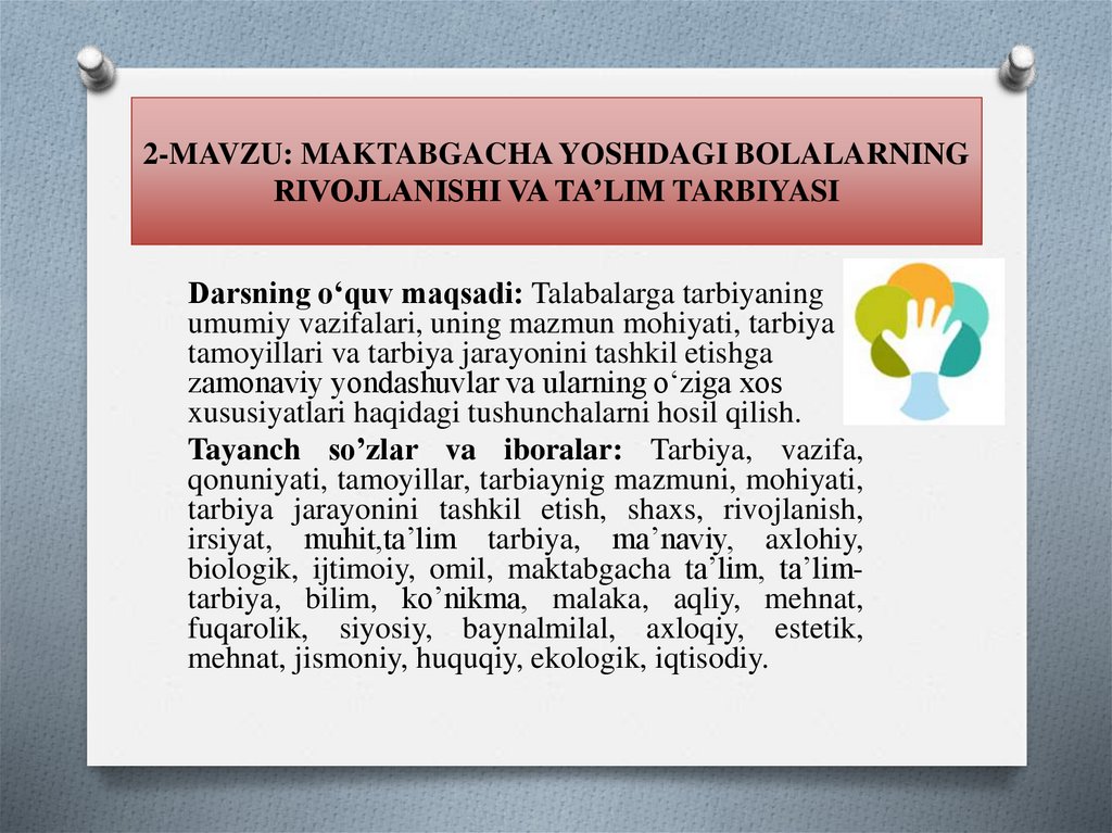 2-MAVZU: MAKTABGACHA YOSHDAGI BOLALARNINGRIVOJLANISHI VA TA’LIM TARBIYASI