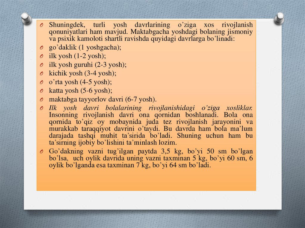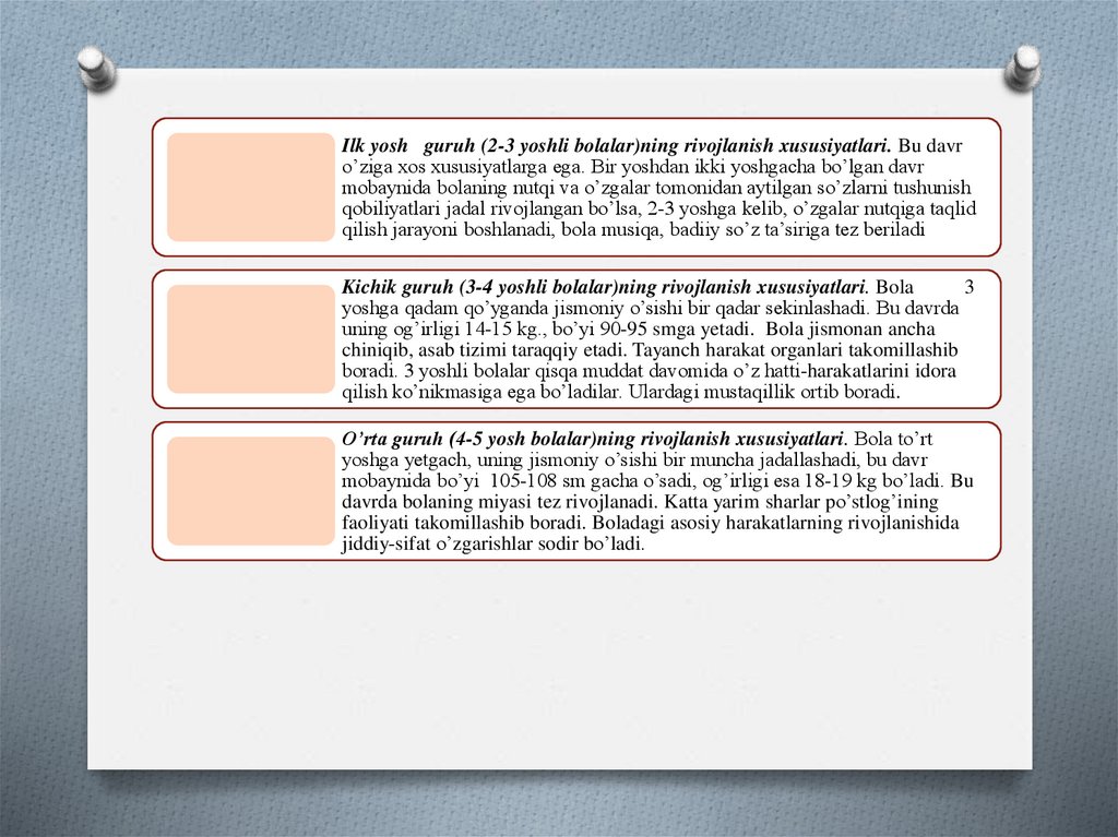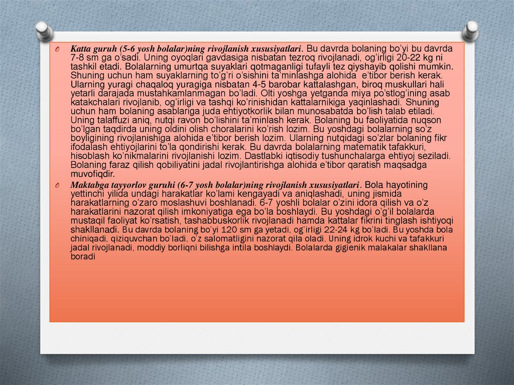 hisobga olish muhimdir. Chunki bola organizmining o’sishi ham, rivojlanishi