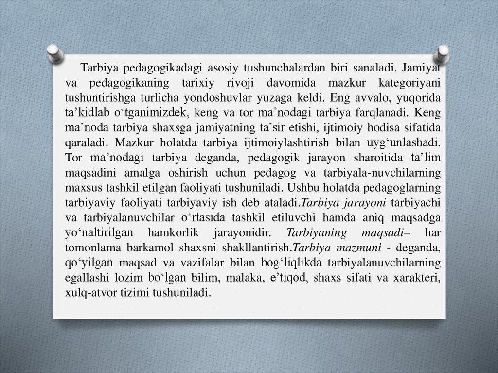 1.Tarbiya jarayoning mazmun va mohiyati nimalardan iborat?