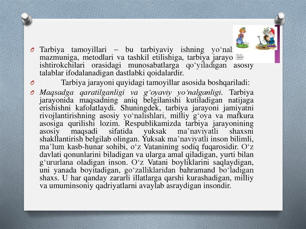 tamoyillari – bu tarbiyaviy ishning yo‘nalishiga,mazmuniga, metodlari va tashkil etilishiga, tarbiya jarayonining