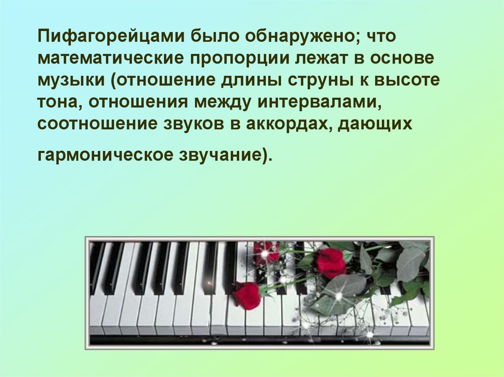 Пифагорейцами было обнаружено; чтоматематические пропорции лежат в основе