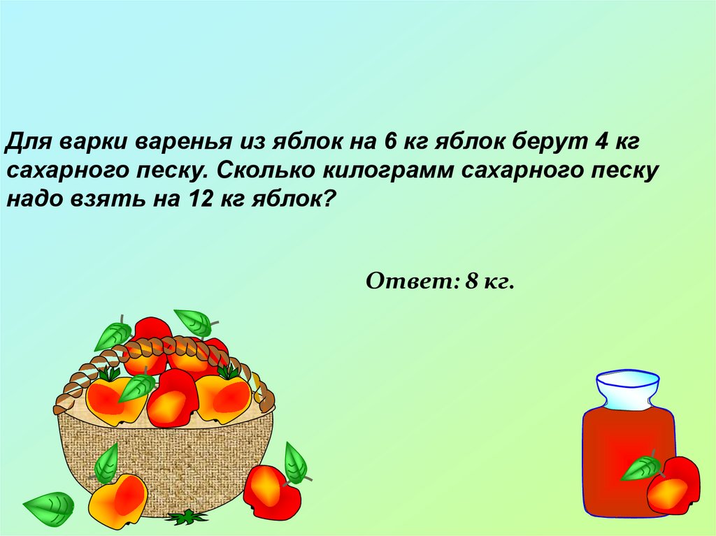 Для варки варенья из яблок на 6 кг яблок берут 4 кгсахарного песку. Сколько килограмм сахарного песку