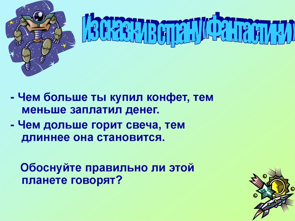- Чем больше ты купил конфет, темменьше заплатил денег.