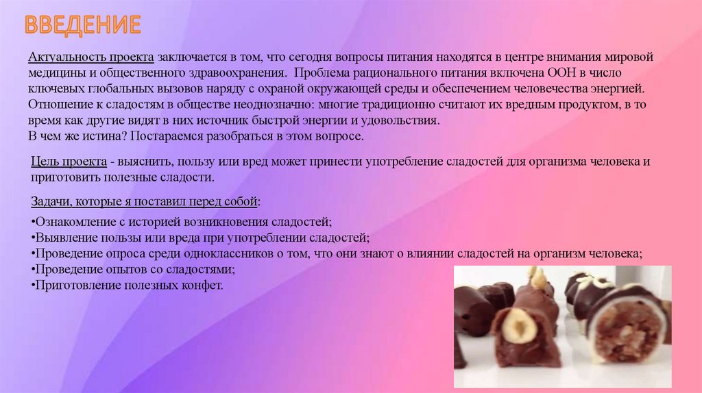 Цель проекта - выяснить, пользу или вред может принести употребление сладостей для организма человека и