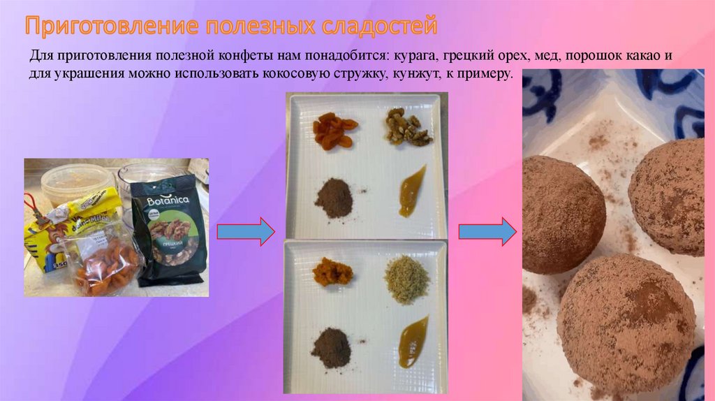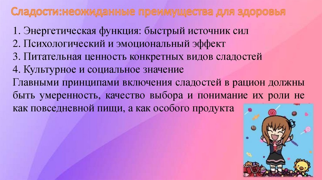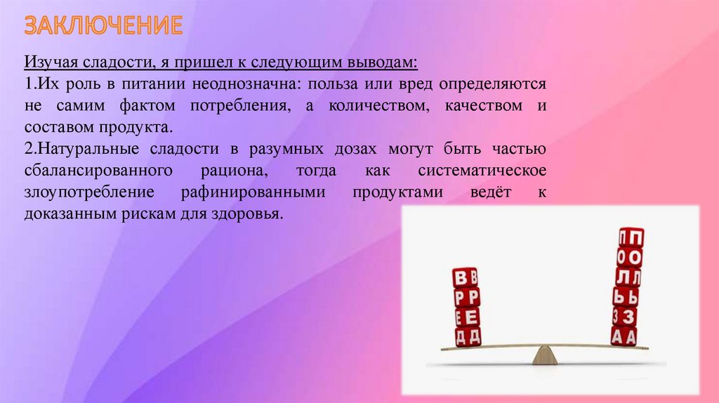 Изучая сладости, я пришел к следующим выводам:1.Их роль в питании неоднозначна: польза или вред определяются