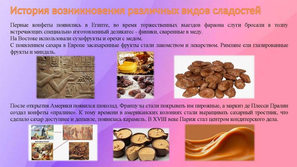 создал конфеты «пралине». К тому времени в американских колониях стали выращивать сахарный тростник, что