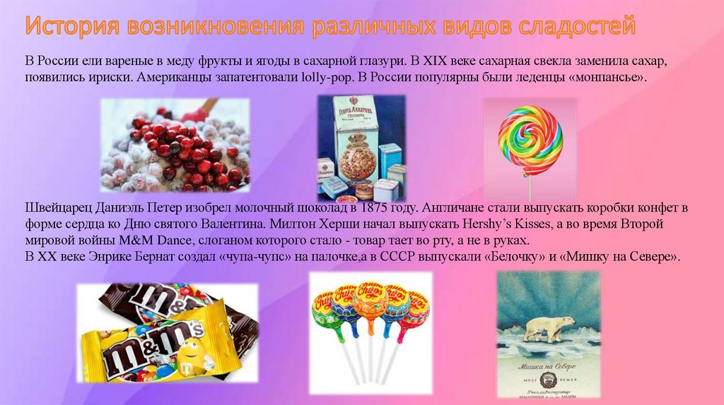 В XX веке Энрике Бернат создал «чупа-чупс» на палочке,а в СССР выпускали «Белочку» и «Мишку на Севере».