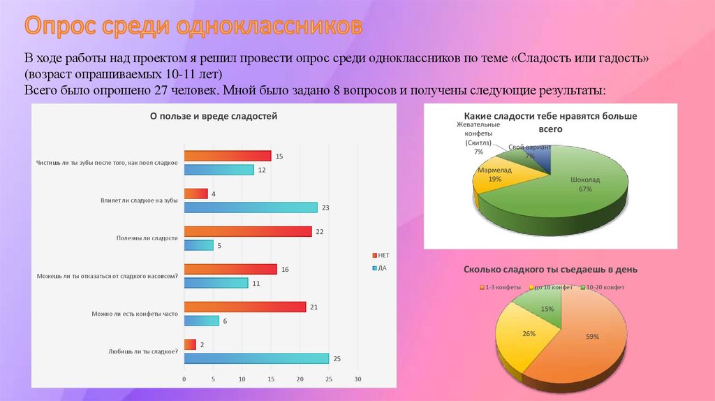 •Проведение опроса среди одноклассников о том, что они знают о влиянии сладостей на организм человека;