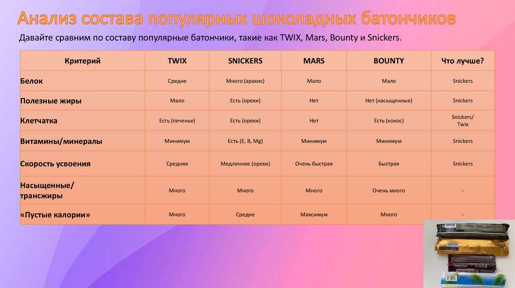 Давайте сравним по составу популярные батончики, такие как TWIX, Mars, Bounty и Snickers.Критерий