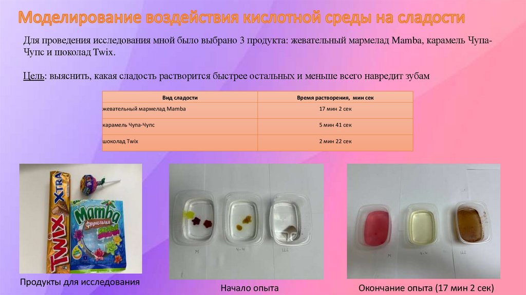 Для проведения исследования мной было выбрано 3 продукта: жевательный мармелад Mamba, карамель ЧупаЧупс и шоколад Twix.Цель: выяснить, какая сладость растворится быстрее остальных и меньше всего навредит зубам
