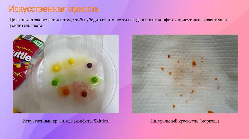 Цель опыта заключается в том, чтобы убедиться,что почти всегда в ярких конфетах присутсвует краситель иусилитель цвета.
