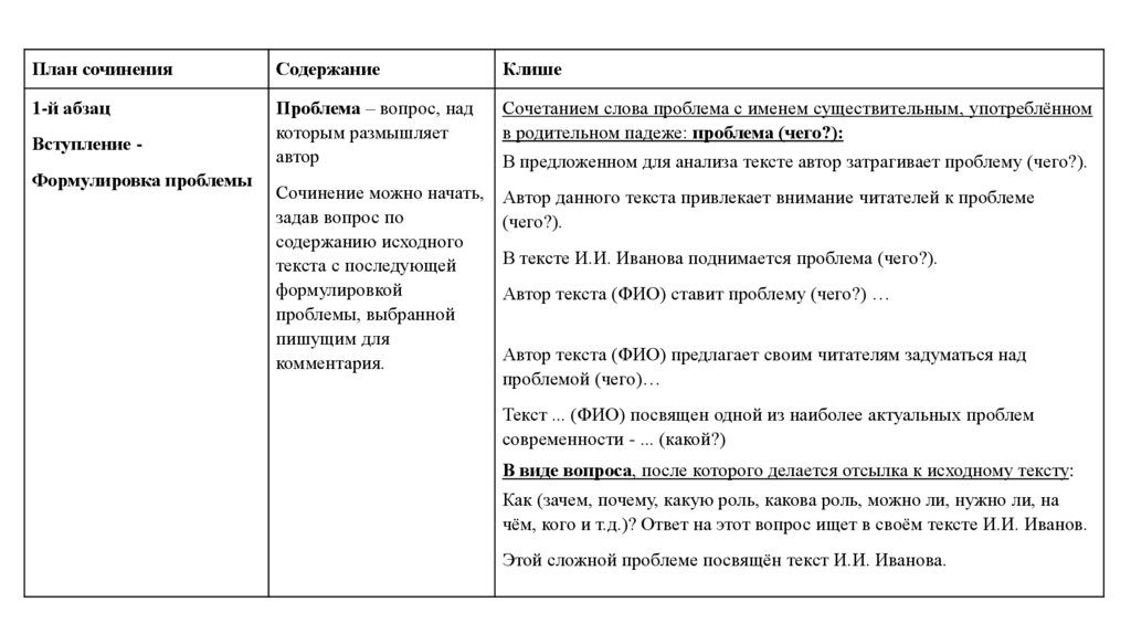 План сочиненияСодержание