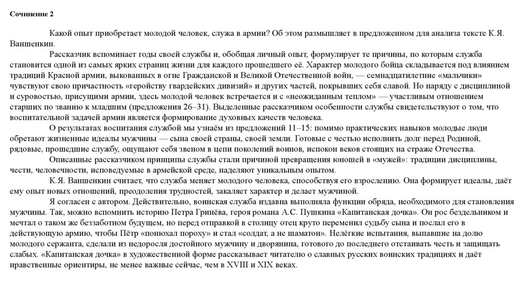 Сочинение 2Какой опыт приобретает молодой человек, служа в армии? Об этом размышляет в предложенном для анализа тексте К.Я.