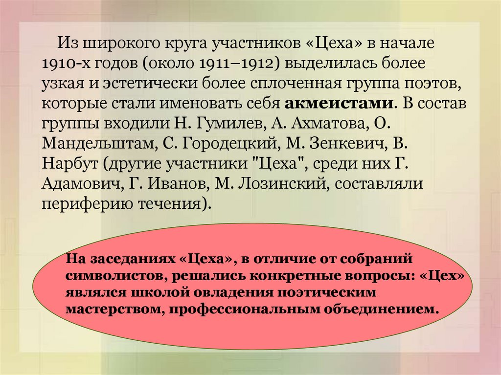Из широкого круга участников «Цеха» в начале1910-х годов (около 1911–1912) выделилась более