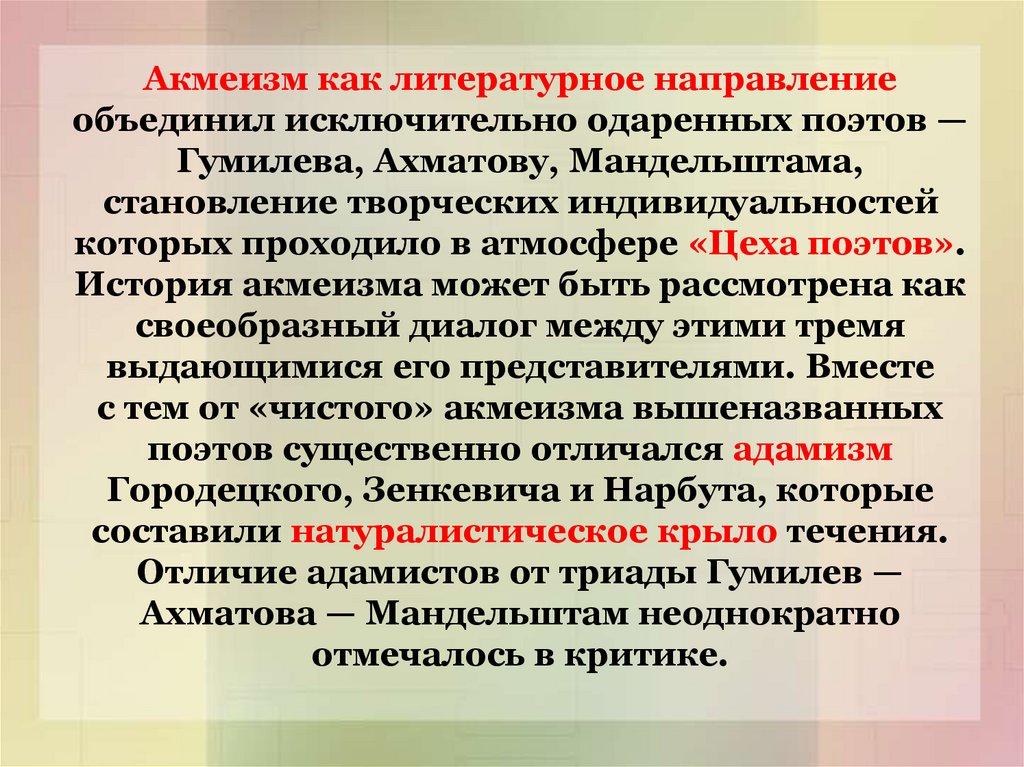 Акмеизм как литературное направлениеобъединил исключительно одаренных поэтов —