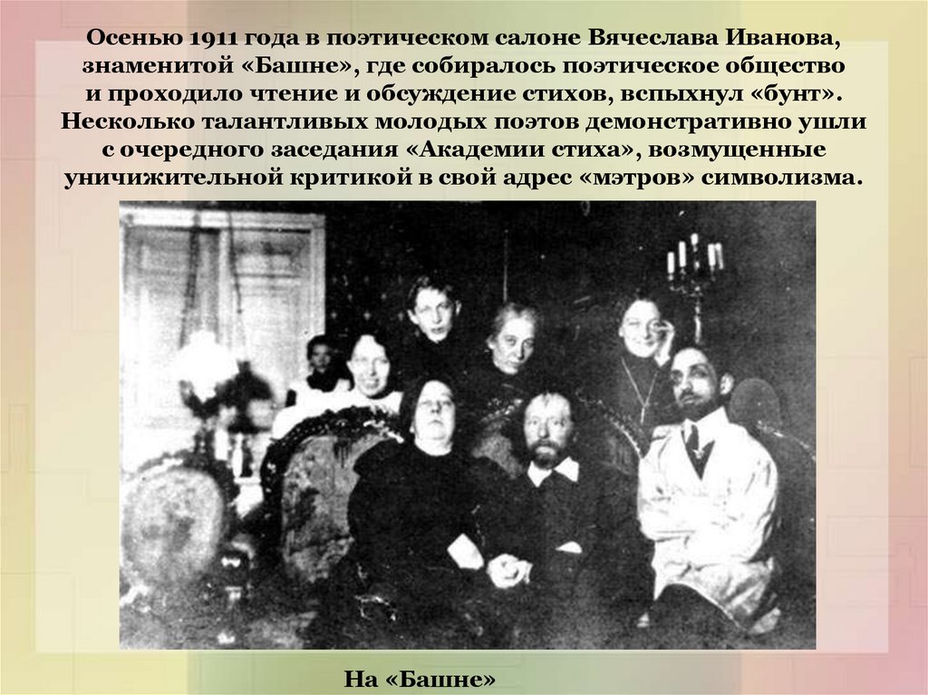 Осенью 1911 года в поэтическом салоне Вячеслава Иванова,знаменитой «Башне», где собиралось поэтическое общество