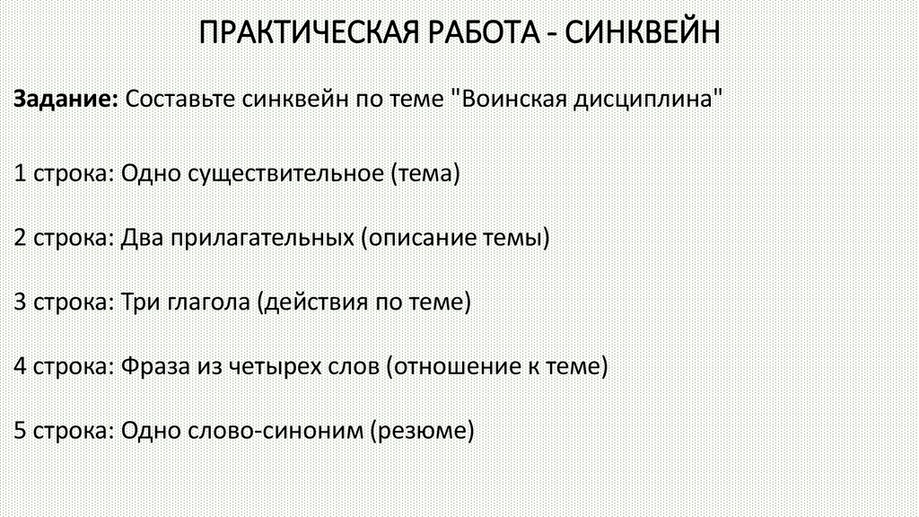ПРАКТИЧЕСКАЯ РАБОТА - СИНКВЕЙНЗадание: Составьте синквейн по теме "Воинская дисциплина"