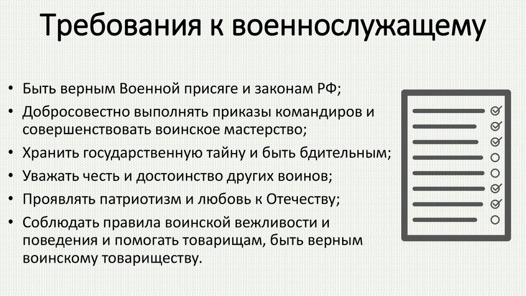 Требования к военнослужащему• Быть верным Военной присяге и законам РФ;