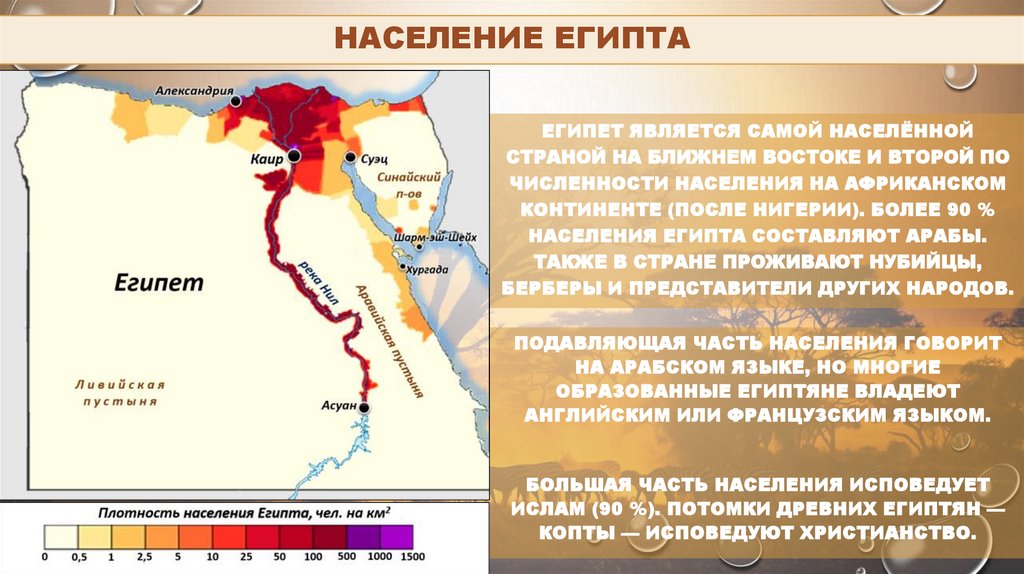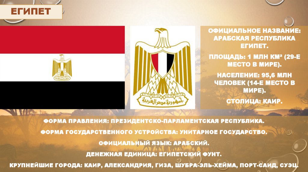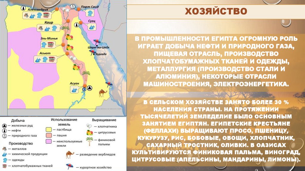 КРУПНЕЙШИЕ ГОРОДА: КАИР, АЛЕКСАНДРИЯ, ГИЗА, ШУБРА-ЭЛЬ-ХЕЙМА, ПОРТ-САИД, СУЭЦ.