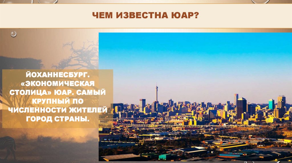 ЧЕМ ИЗВЕСТНА ЮАР?ЙОХАННЕСБУРГ.