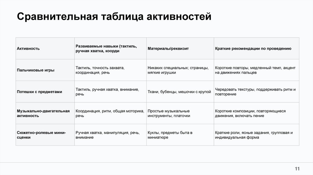 Сравнительная таблица активностей