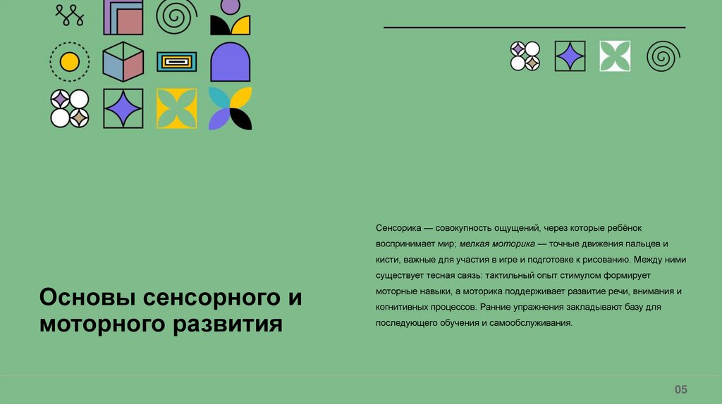 Сенсорика — совокупность ощущений, через которые ребёноквоспринимает мир; мелкая моторика — точные движения пальцев и