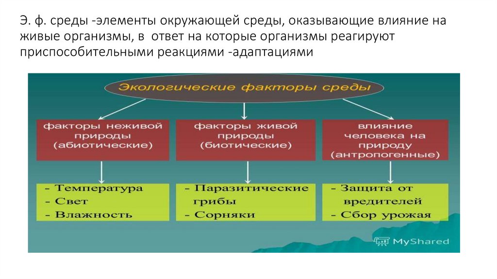 1. Э. ф. среды -элементы окружающей среды, оказывающие влияние на живые организмы, в ответ на которые организмы реагируют